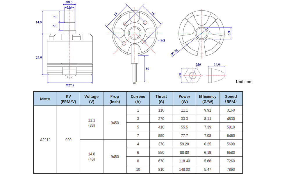 A2212 ブラシレスモーター 920KV マルチコプタードローンなど用