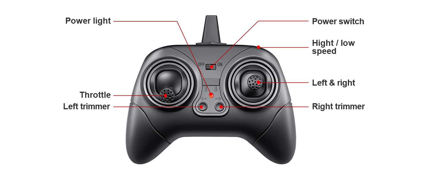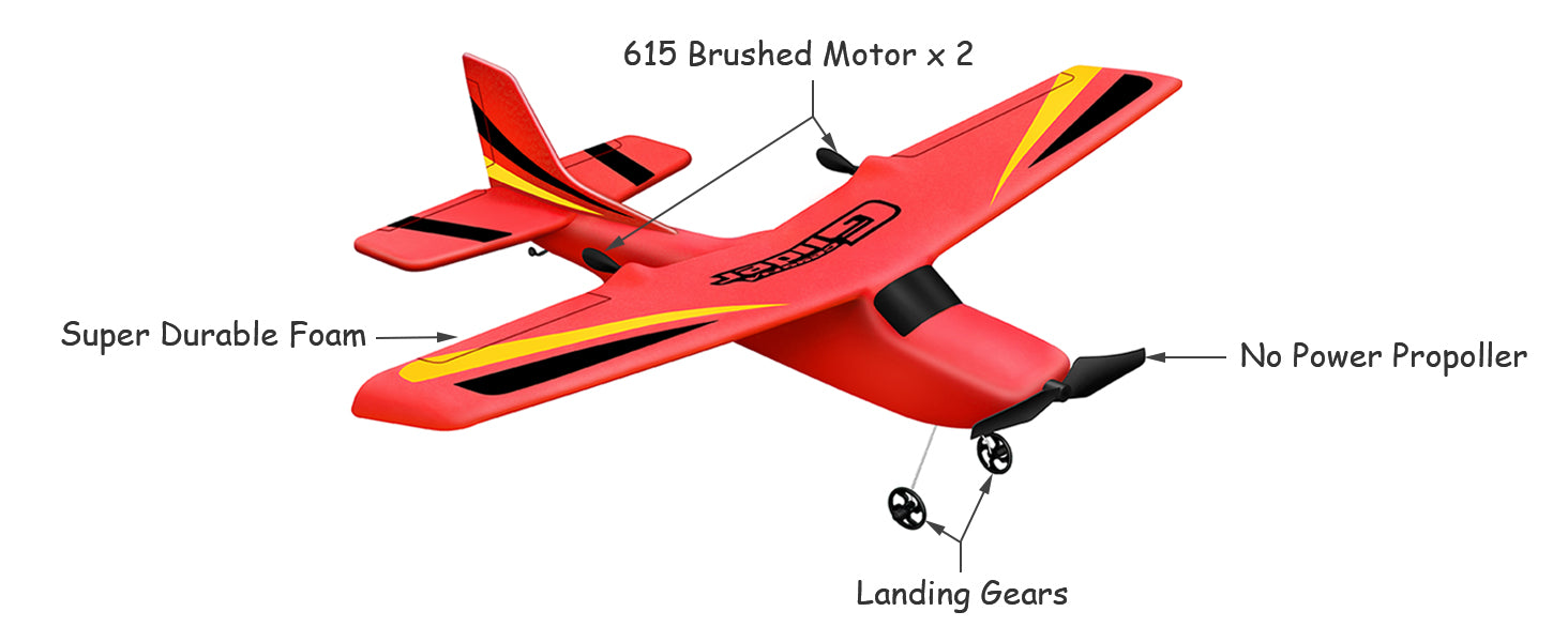 - 2.4GHz 無線制御システム – リモコンは飛行機を上下左右の 4 方向に制御できます。また、2 機以上の飛行機が相互に混乱することなく一緒に飛行することができます。