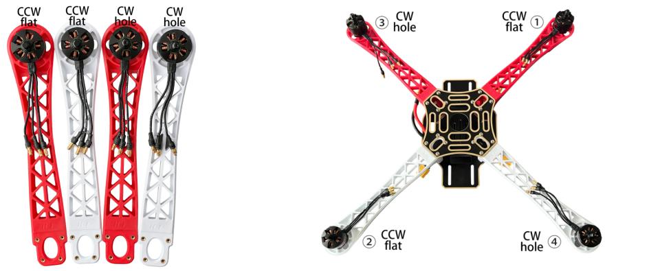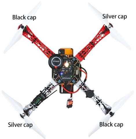 #1 #2 motors install silver-capped propellers, and #3 #4 motors install black-capped propellers.