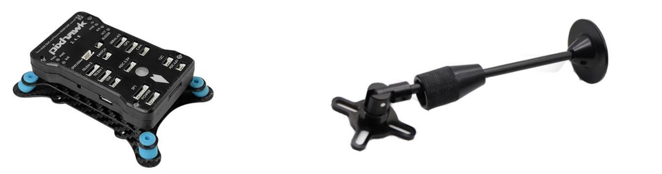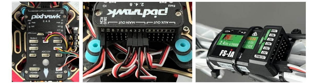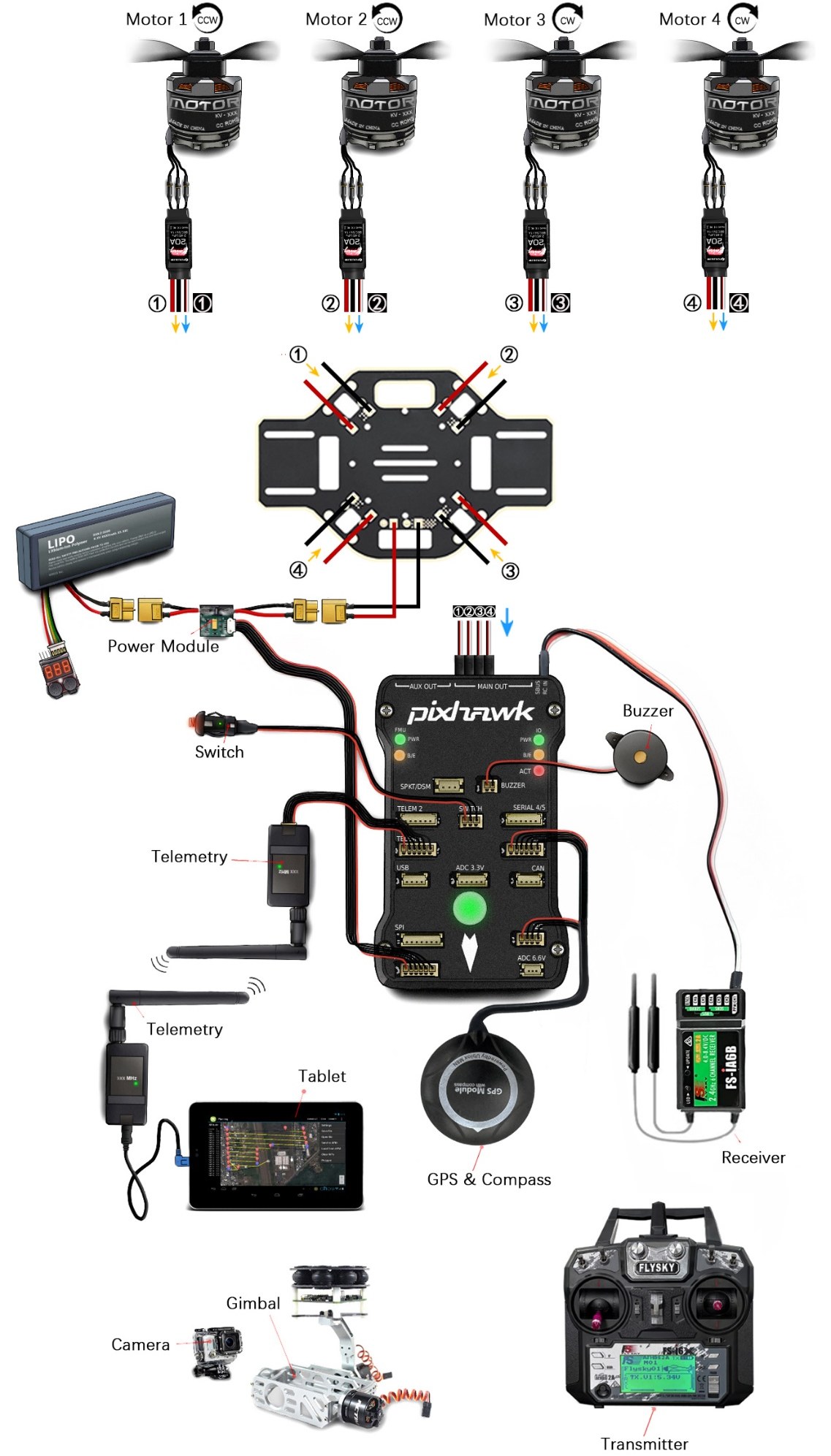 - The Pixhawk is installed on the top, the battery in the middle, and the equipment at the bottom (if you have).