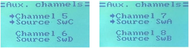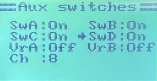 Steps: Long press OK - System setup - Aux switches – SwA: ON, SwB: ON, SwC: ON, SwD: ON, Ch: 8 - Long press CANCEL to save and exit