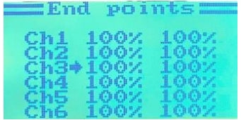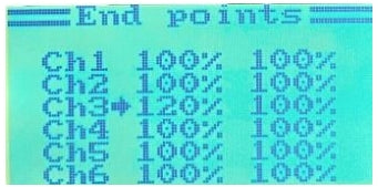 Steps: Long press OK - Functions setup – End point - Channel 3 - Take throttle at minimum - Chang 100% to 120% - Long press CANCEL to save and exit