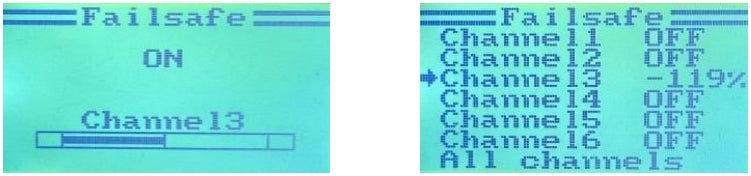 Path: Long press OK - System setup - RX Setup - Failsafe - Channel 3 ON – Take throttle at minimum - Long press CANCEL to save and exit