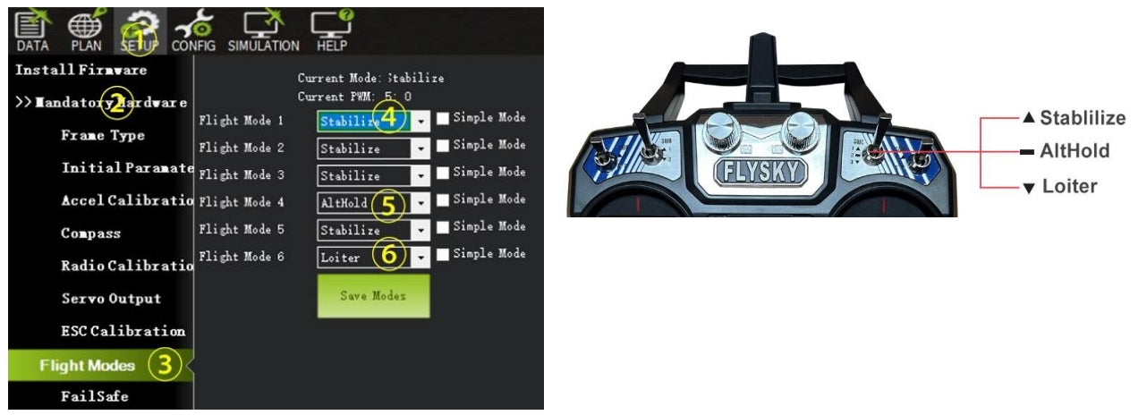 Use channel 5 switch to choose flight mode. We recommend newcomers use Loiter Mode, as it will help you complete a smoother flight with both GPS and barometer engaged.