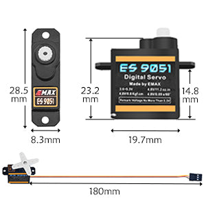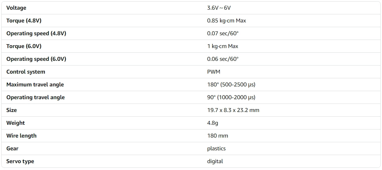 - Super Small Size - Servo dimension: 19.7x8.3x23.2 mm, Total servo weigh: 4.8g