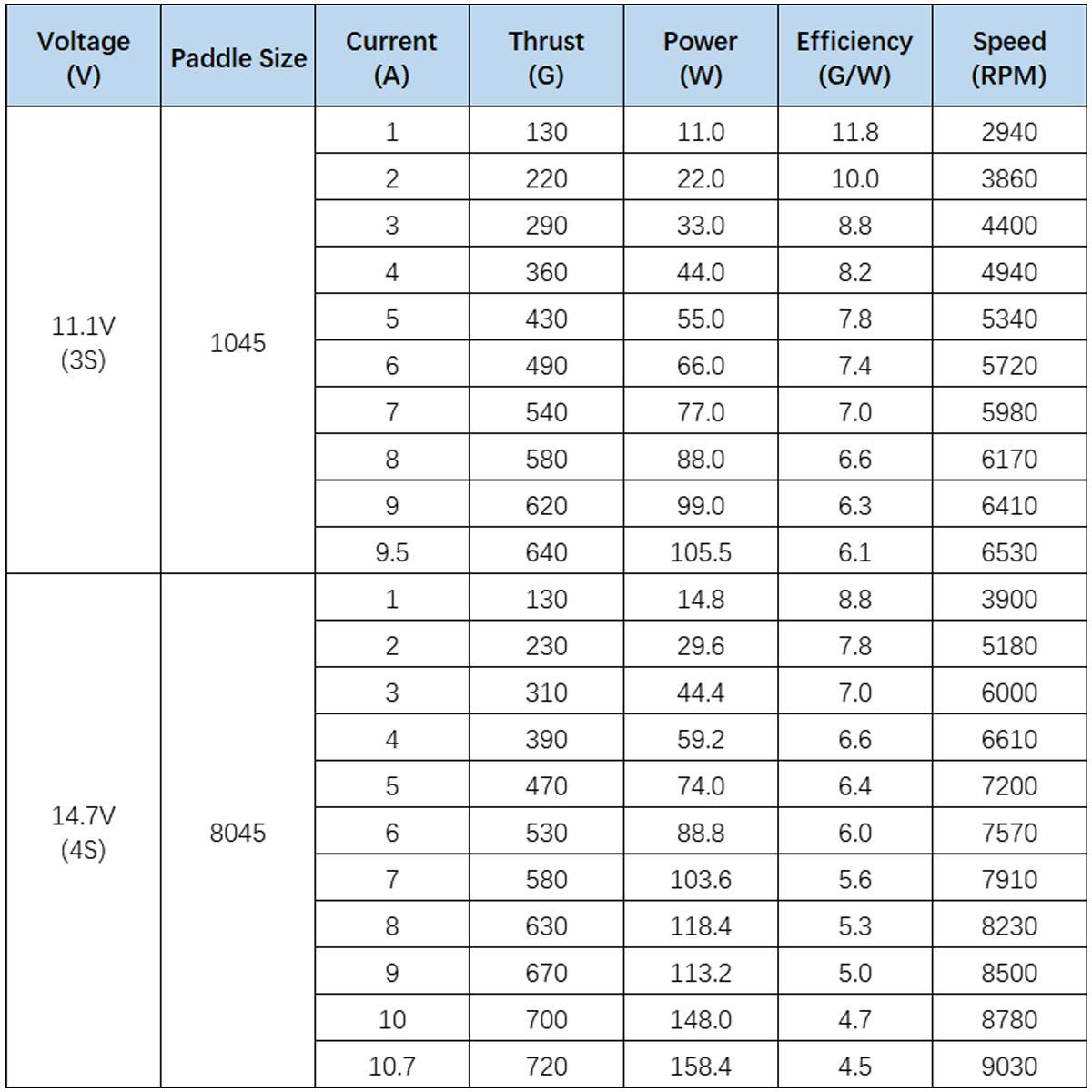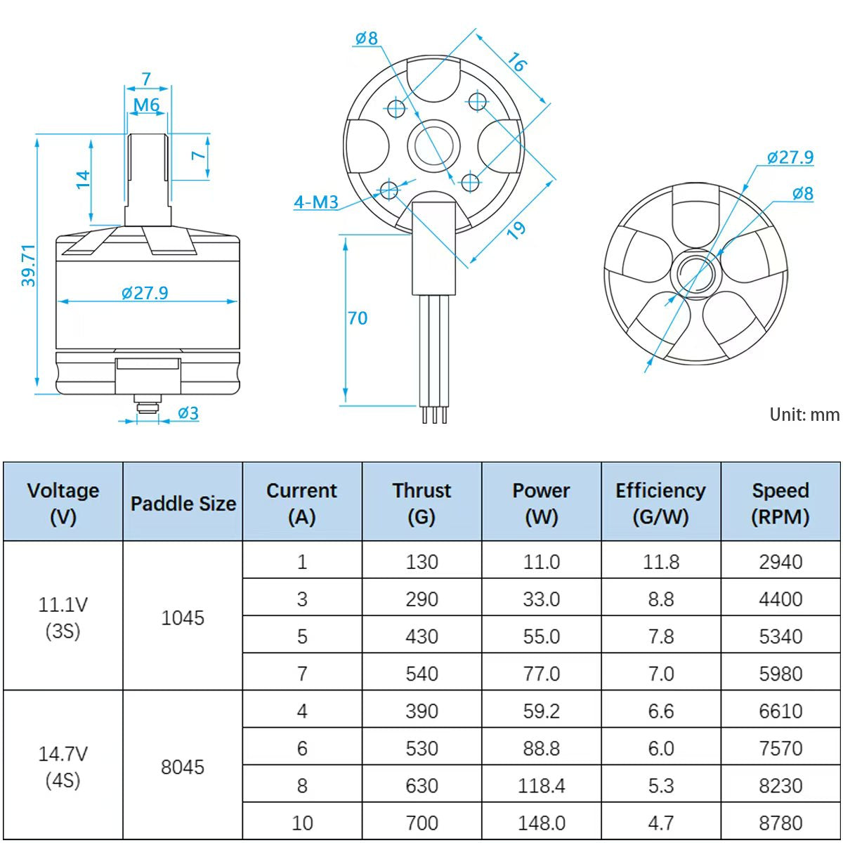 ๐๐ฉ๐๐๐ข๐๐ข๐๐๐ญ๐ข๐จ๐ง๐ฌ - KV: 935, Voltage: 7.4-14.8V (2-4S), Weight: 53g, Hole Pitch: 16mm&19mm, Prop size: 8-10 inch