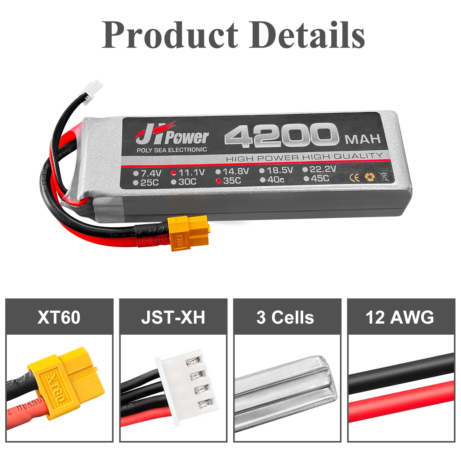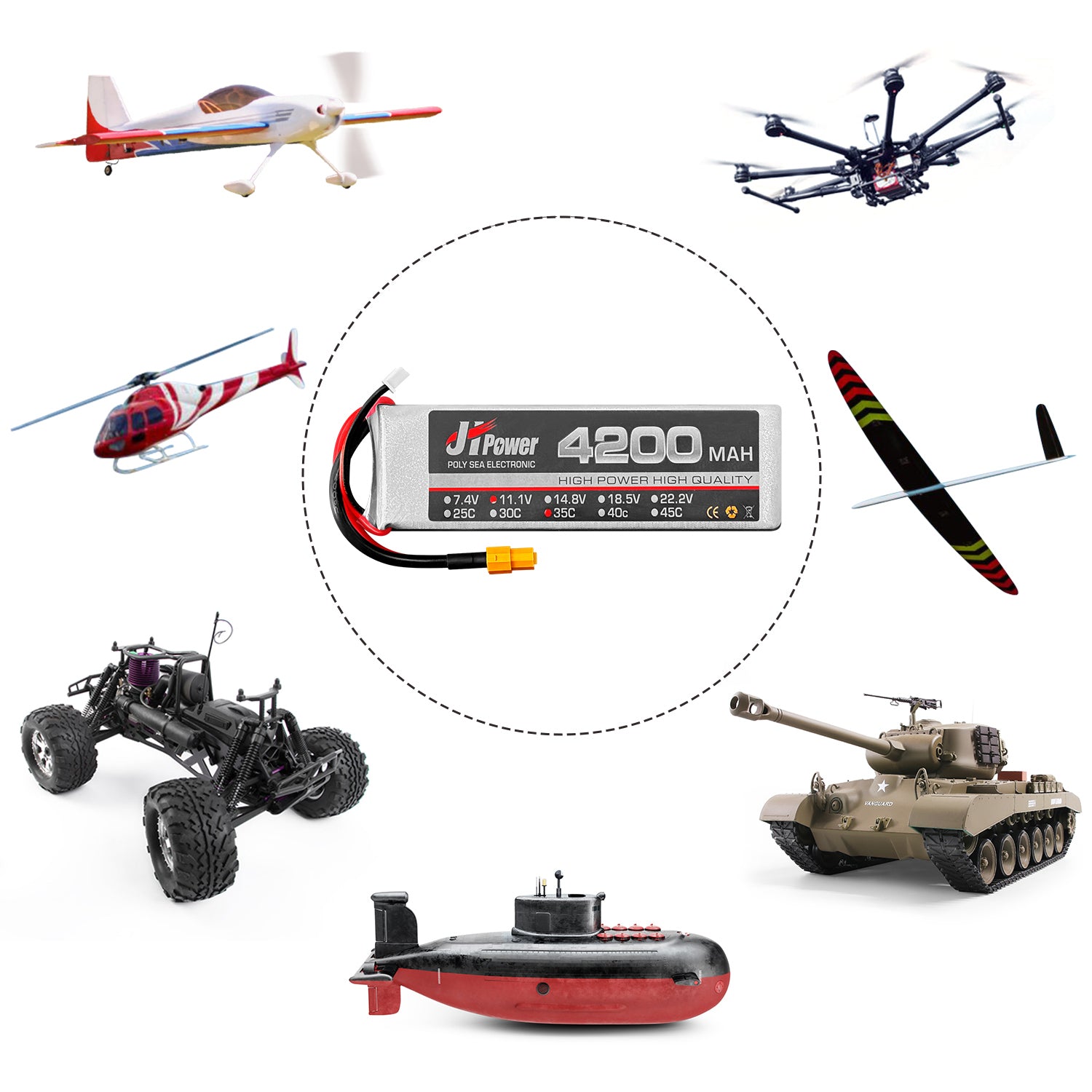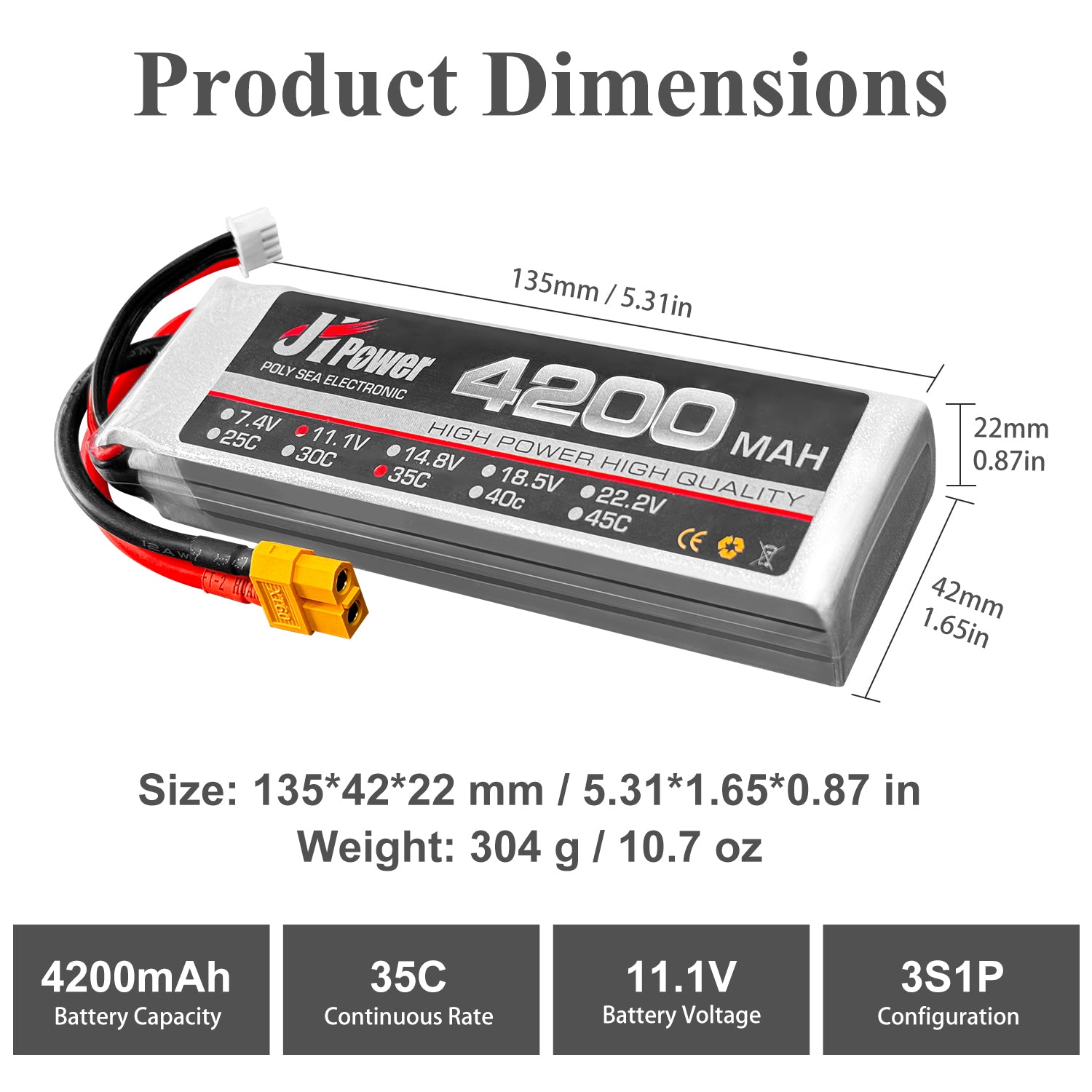 - 【Battery Specification】Material: Lithium polymer; Voltage: 11.1V; Configuration: 3S1P; Capacity: 4200mAh; Discharging rate: 25C; Connector: XT60 plug